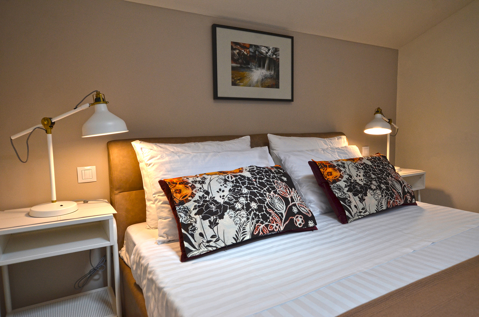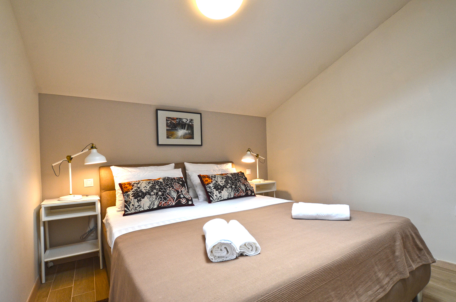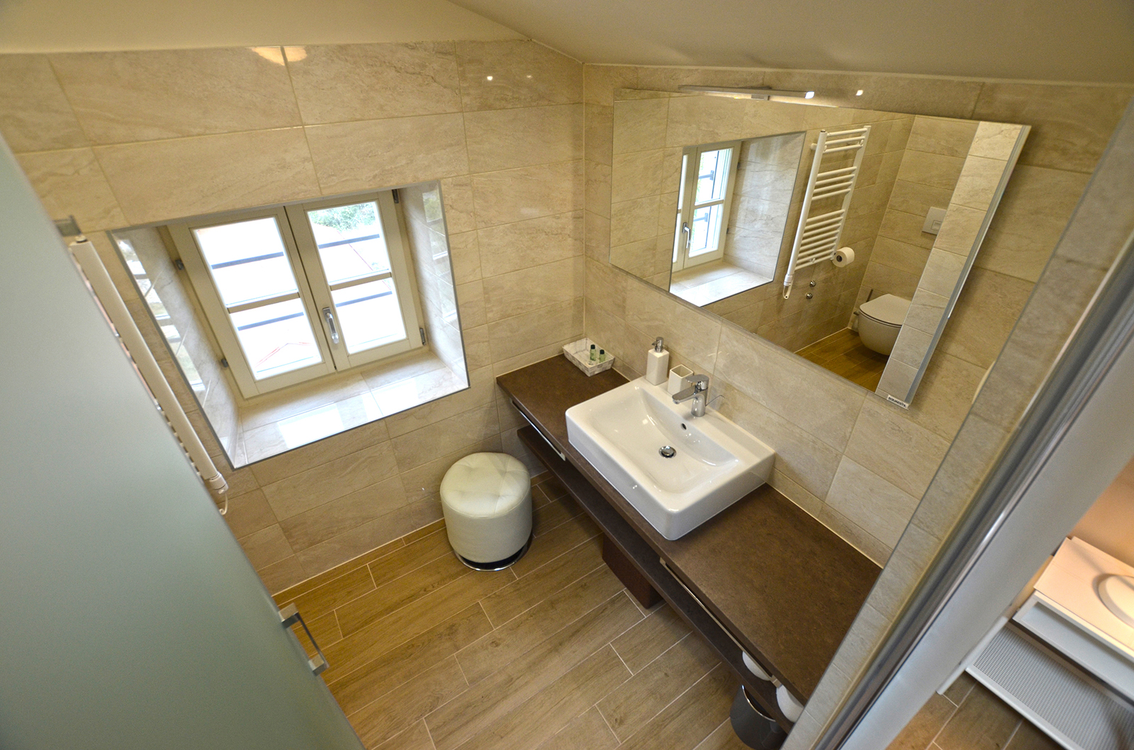 The spacious apartment located on the third floor of the house consists of a double room connected to the bathroom by a glass door.